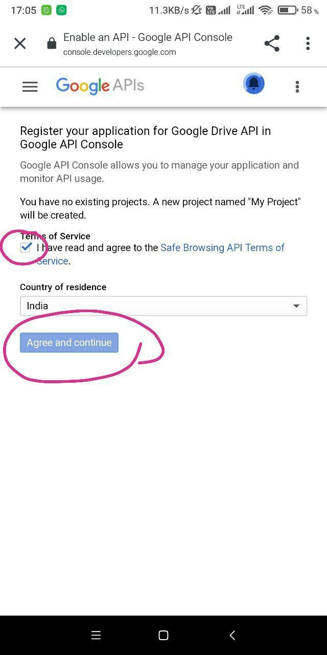Now select create project , accept the Terms of Service, and select your Country.